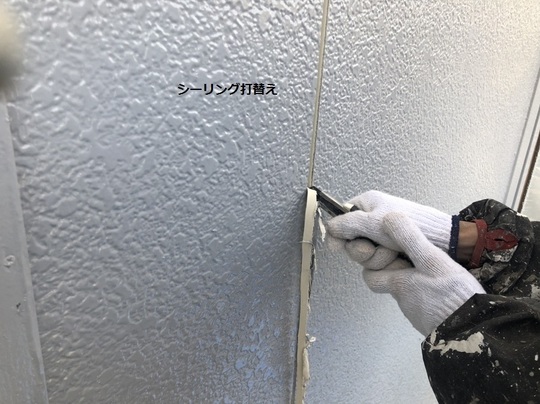 サイディングの伸縮目地(たて目地)は古いシールを撤去後、打ち替えます。