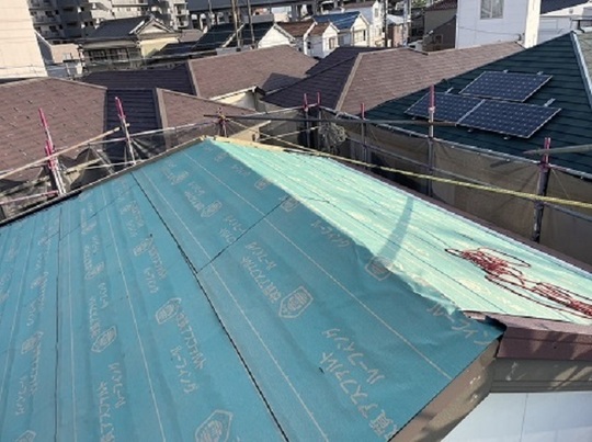 棟板金などを撤去して全体にルーフィング(防水シート)を張ります。